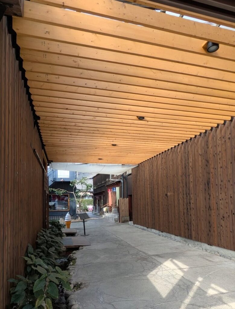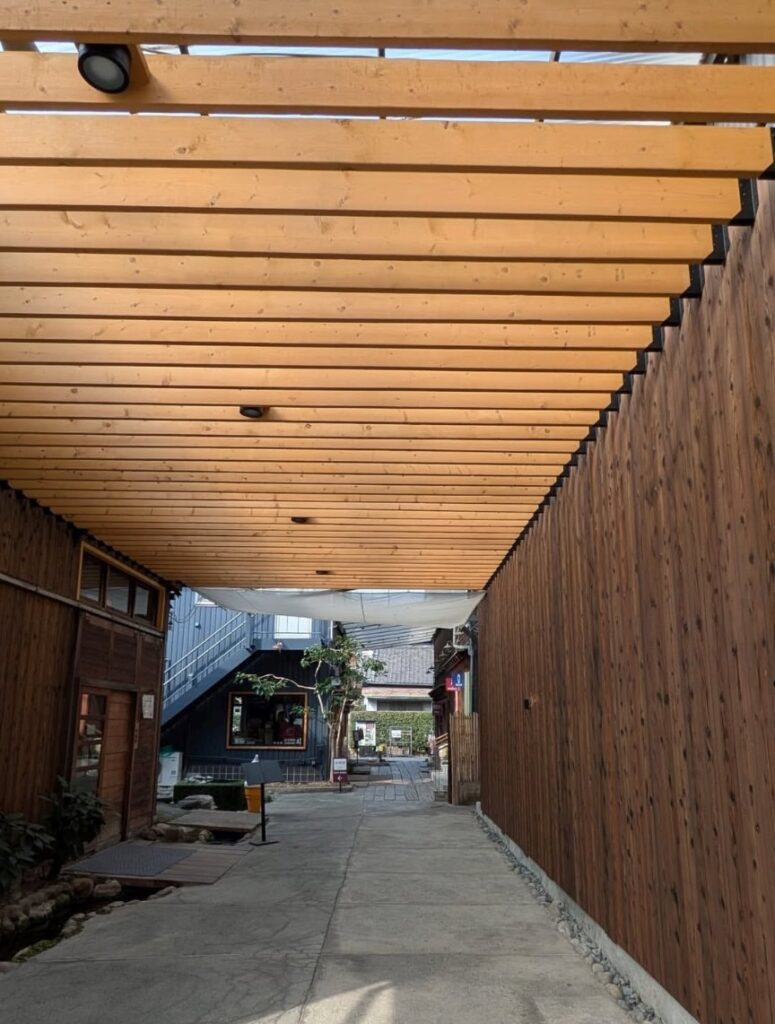 シックな木の色合いとモダンな構造の通路が、