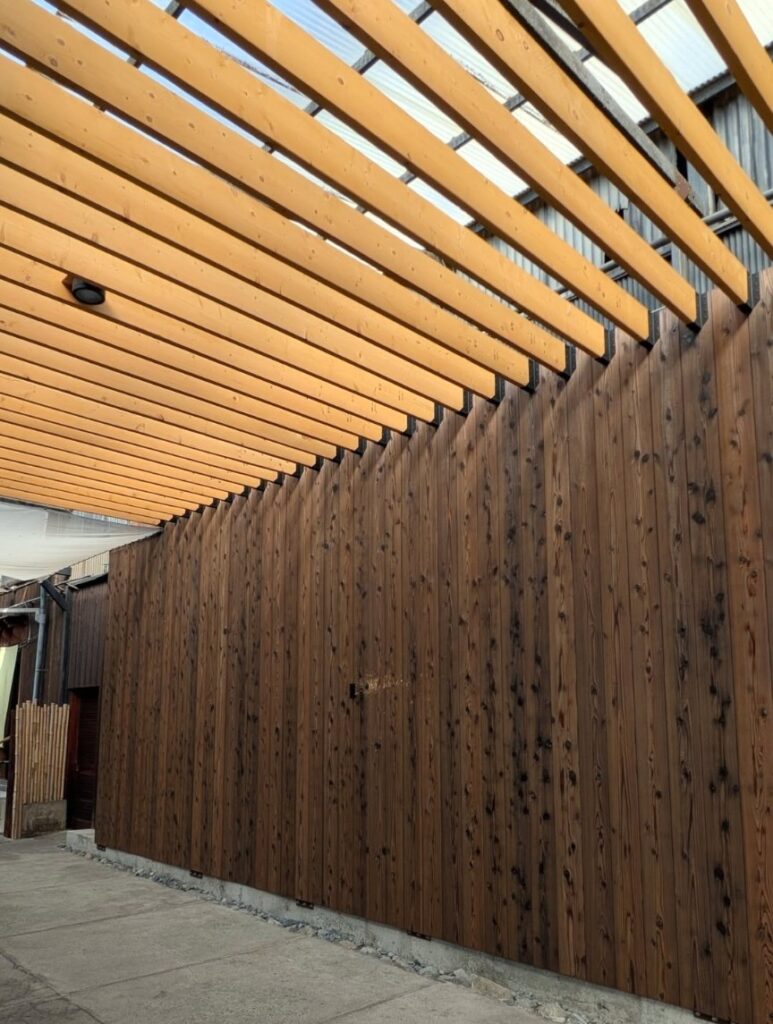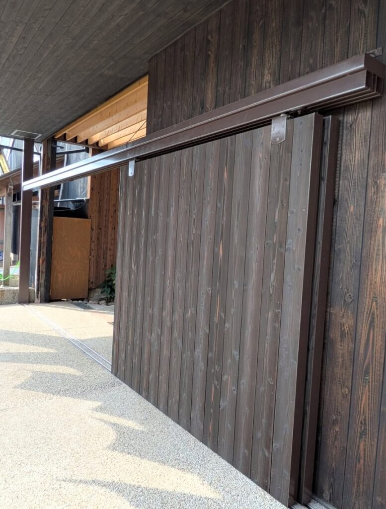 建物と一体化するような大型スライドドアを設置デザインしました。